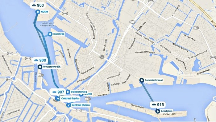 North Amsterdam is separated from the centre by a large canal called: the IJ. The most convenient way of crossing this canal, is to take a ferry. Because there are a lot of ferries operating in a short route you rarely have to wait more than a few minutes. Most of the ferries depart outside the Amsterdam central station.other places to get on board are displayed below. The best thing about this service is that it is absolutely FREE!